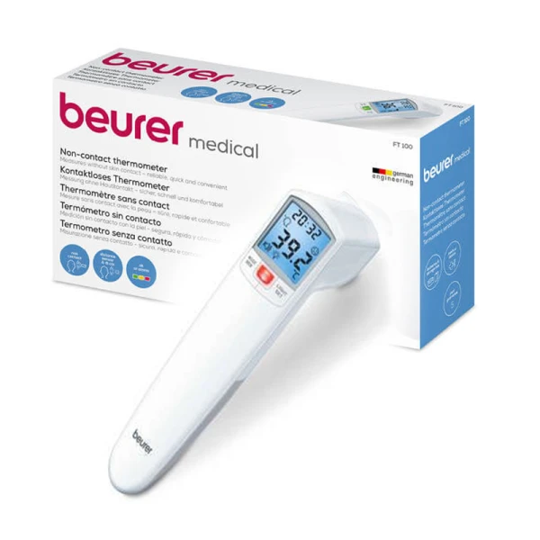 مشخصات FT 100 beurer تنها ترمومتر کلینیکال موجود در ایران: کمپانی آلمانی Beurer که از سال 1919 در امر تولید تجهیزات پزشکی سابقه دارد، نمونه های مختلفی از تب سنجهای دیجیتال را به بازار عرضه کرده است. تب سنج دیجیتال بیورر مدل FT100 قابلیت سنجش دمای بدن، دمای محیط و دمای سطح را دارد. برای این تب سنج سنسور فاصله تعبیه شده تا بدون نیاز به تماس، بتوانید دمای بدن افراد به خصوص نوزادان و کودکان را اندازه گیری کنید. این تب سنج دمای بدن را با چراغ LED به شما هشدار می دهد.