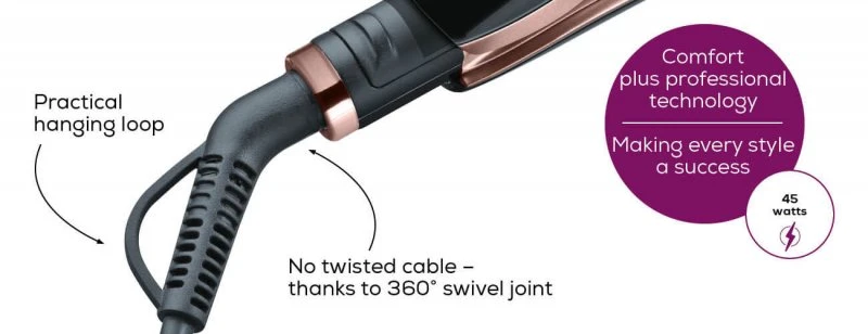 یکی از برگ های برنده در اتو و حالت دهنده مو بیورر مدل HS80 عملکرد یونی 3 سطحی برای حفاظت از مو و درخشان و براق کردن مو است که با نفوذ به لایه های درونی ساقه مو لطافت و درخشندگی را برای موهای شما به ارمغان خواهد آورد. این عملکرد پیشرفته یونی با قابلیت تنظیم دمای 120 تا 220 درجه سانتی گراد می تواند برای هر مدل مو با هر اندازه ای مناسب درون بسته بندی این محصول یک کیف قابل حمل که در برابر حرارت مقاوم می باشد وجود دارد و شما می توانید در سفر و مکان های مختلف از این محصول استفاده نمایید. همچنین اتو مو بیورر HS80 با سیم کابل مقاوم با قابلیت چرخش 360 درجه هیچ نگرانی از پیچ خوردگی سیم به وجود نمی آورد و در امتداد سیم یک حلقه برای آویزان کردن محصول تعبیه شده است.
